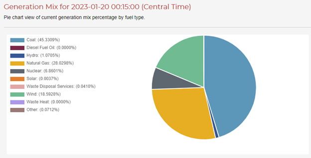 At 12:15 a.m. on Jan. 20, the mix of power generation from the SPP was 45.3 per cent coal, 28 per cent natural gas, and 18.6 per cent wind. Nuclear made up 6.9 per cent, hydro was 1 per cent, and solar, waste disposal services and waste heat were all negligible or zero.