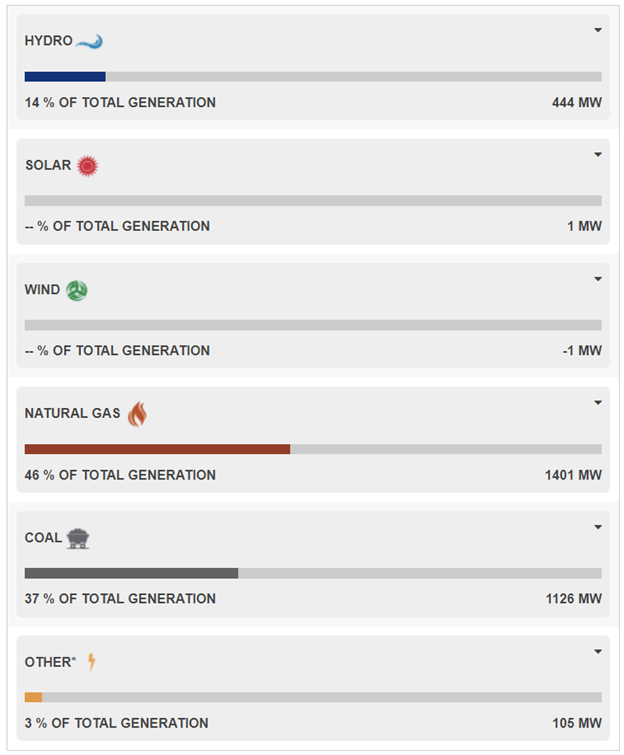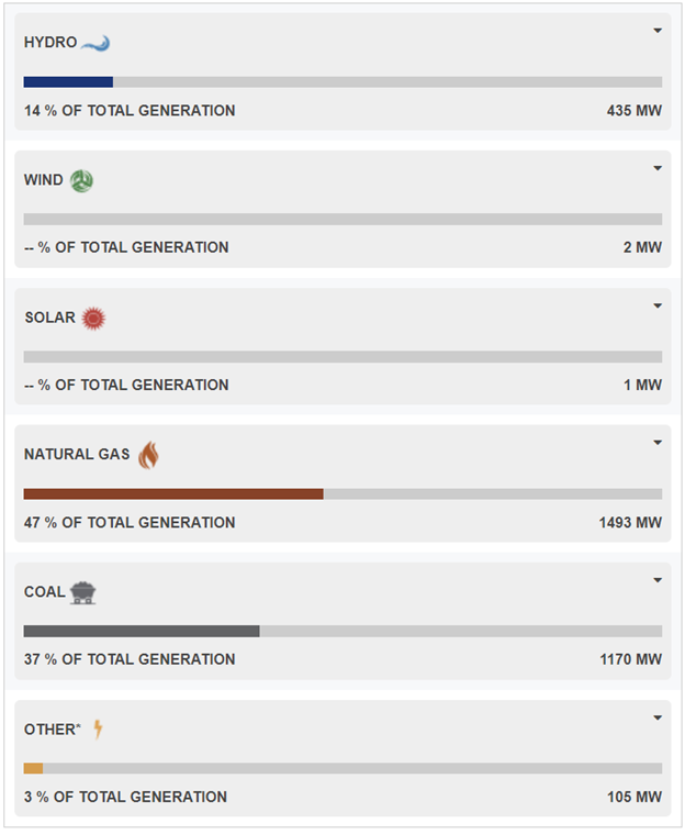 Then on Wednesday, Jan. 18, natural gas made up 47 per cent of average total generation, with a total of 1,493 megawatts. Coal was an average of 37 per cent, or 1,170 megawatts. Hydro came in at 14 per cent, or 435 megawatts. “Other” was three per cent, or 105 megawatts. The aforementioned wind was 2 megawatts, or negligible, and solar was 1 megawatt, also negligible.