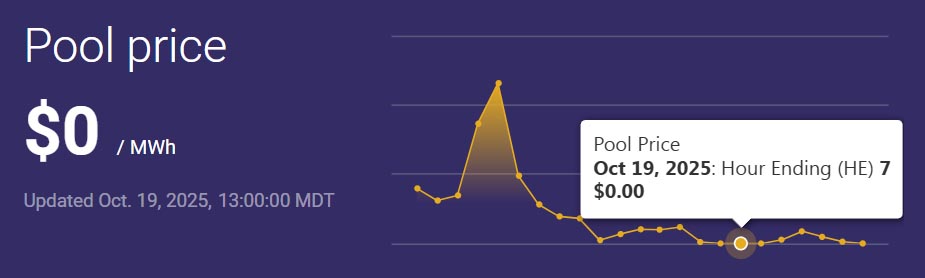 Saturday and Sunday, Oct. 18 and 19 have seen strong wind output on the Alberta electrical grid. And the result on Sunday, as is typical when this happens, is free power for the neighbours.