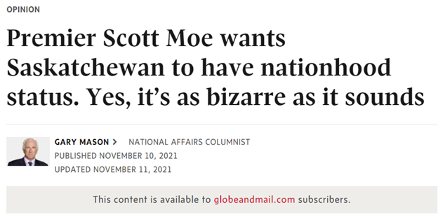Re Premier Moe Wants Saskatchewan to have Nationhood Status…(Nov. 10):