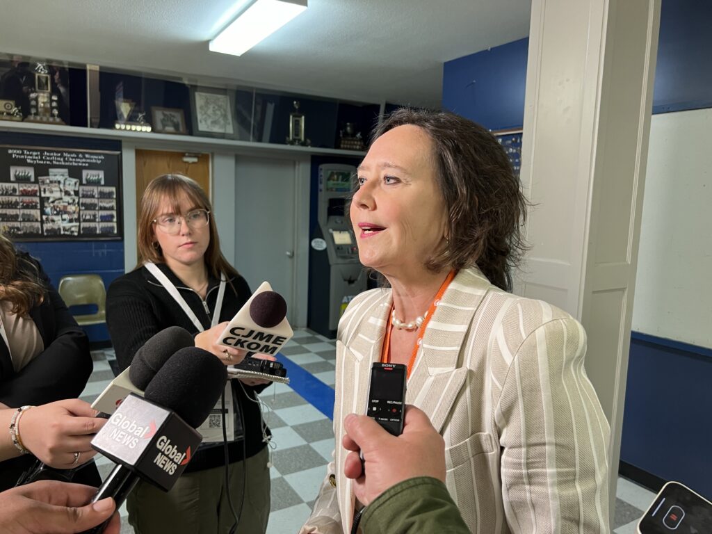 Minister of Justice and Attorney General Bronwyn Eyre, speaking about a federal “gag law,” in a scrum in Weyburn on June 5. Photo by Brian Zinchuk