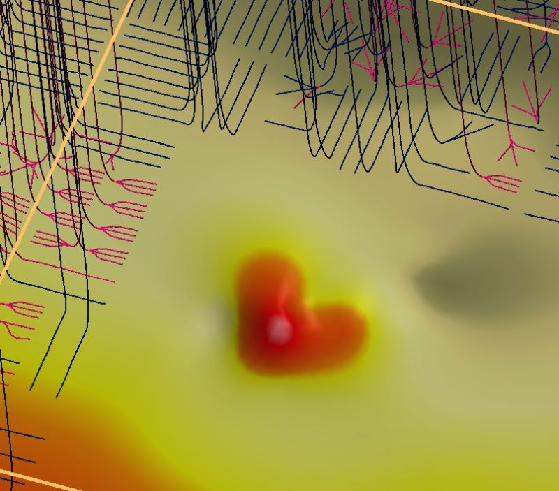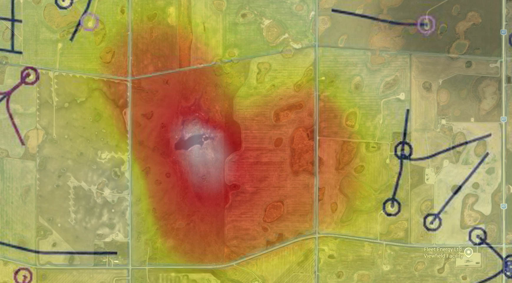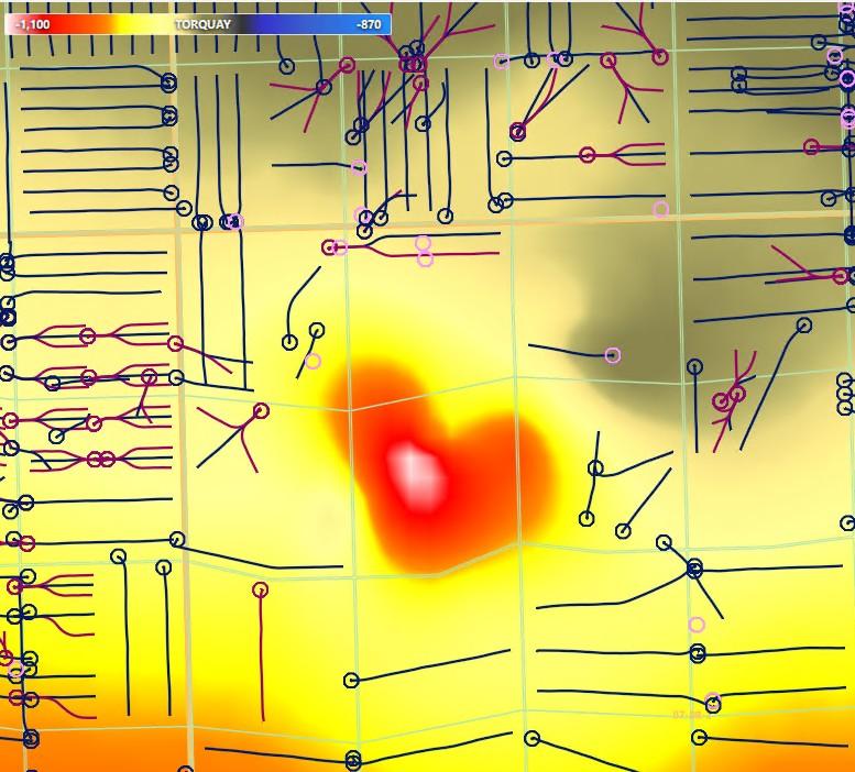 That red blob is the Viewfield Crater, about a kilometre deep. Several wells, including vertical wells, have been removed from the graphic, but you can see them in the one below. Chinook Consulting Services