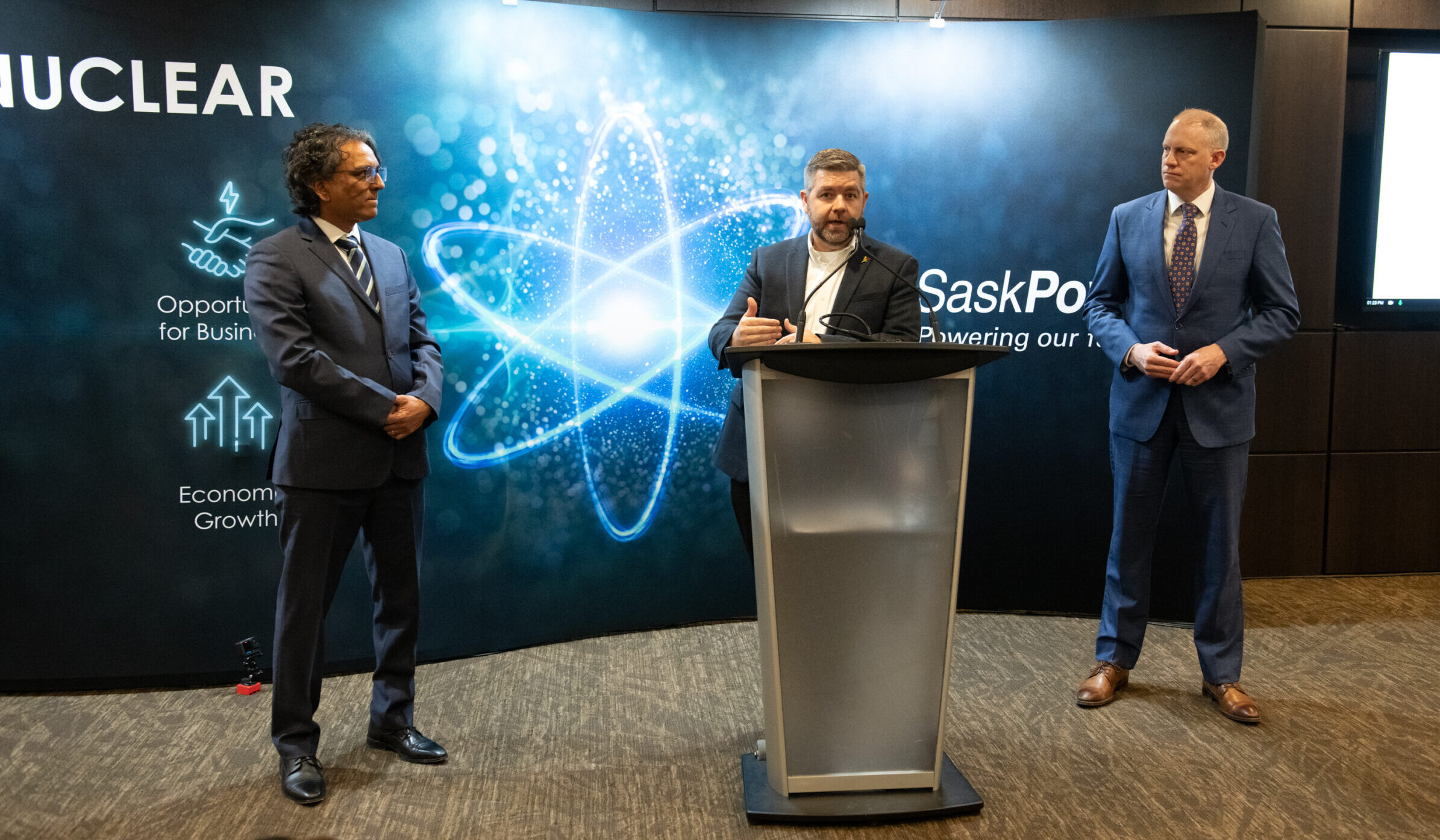 SaskPower CEO Rupen Pandya, left, Minister of Crown Investments Corp. Jeremy Harrison, and SaskPower Nuclear VP David Brock, Photo by Brian Zinchuk