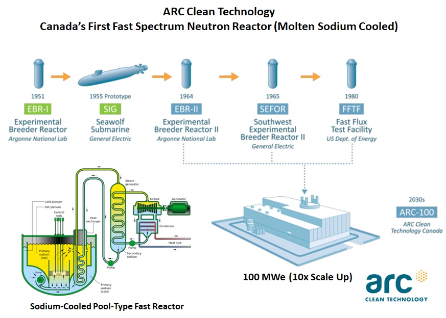 ARC’s liquid sodium cooled SMR has a 100 MWe power output that is 8x smaller than Ontario Power Generation’s (OPG) Darlington facility CANDU reactors and 3x smaller than the GE Hitachi BWRX-300 SMR also being built at Darlington and chosen by SaskPower as a candidate technology vendor.
