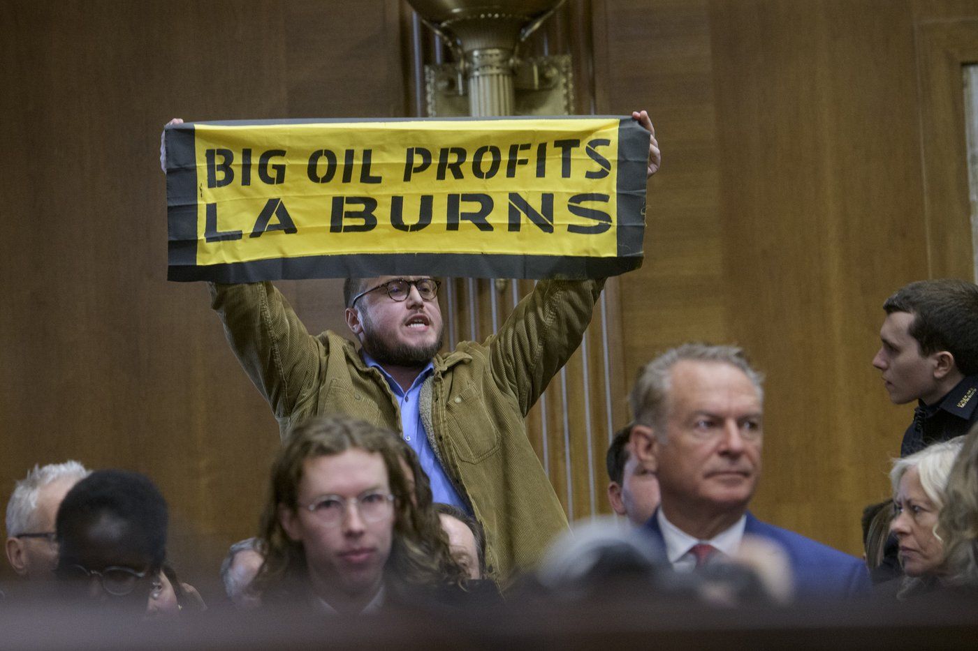 One protester yelled “LA is burning” and another shouted “I’m 18 years old and I want a future!” They held up signs that read, “big oil profits, LA burns.”
