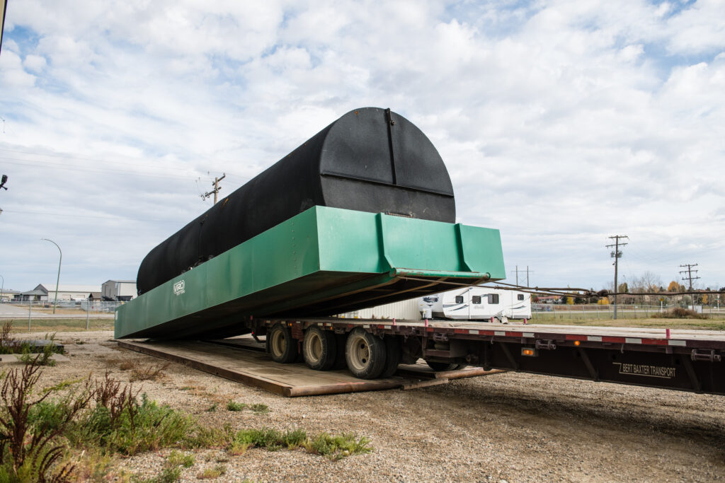 This tank, from Latus Oilfield Services, was transported by Bert Baxter Transport. Both are based in Estevan. The tank was delivered to Arizona Lithium’s Emerald Park location on Oct. 17. Photo by Brian Zinchuk