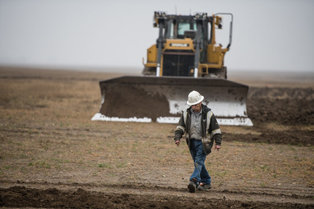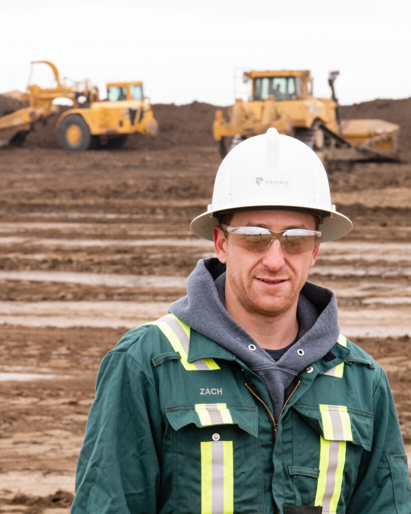 Arizona Lithium executive director Zach Maurer at the site where the company intends on building its first commercial lithium extraction facility, southwest of Torquay. Behind him, a crew from Jerry Mainil Ltd. of Weyburn strips topsoil on Oct. 23. Photo by Brian Zinchuk