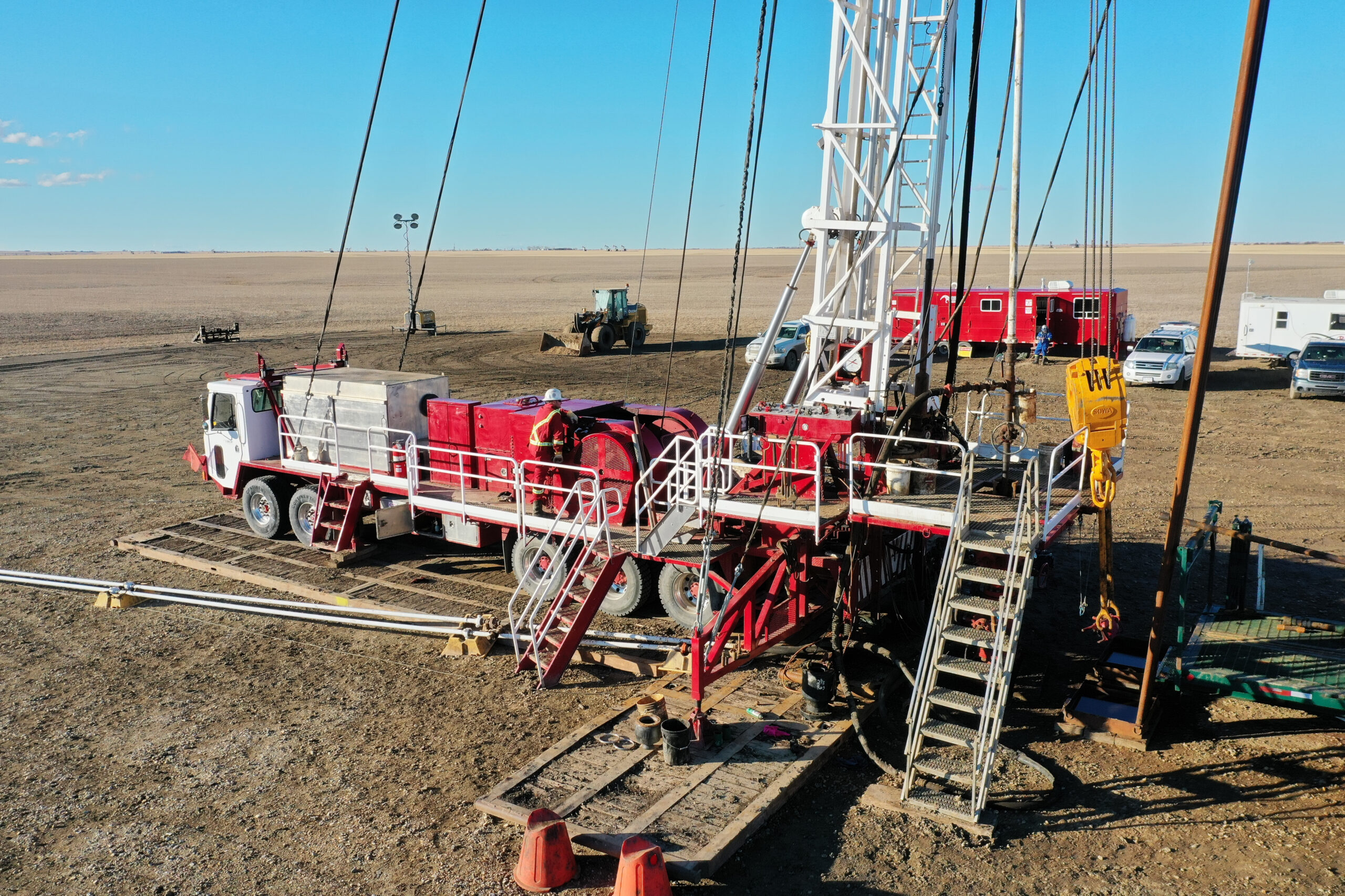 This well was originally drilled for Deep Earth Energy Production, a geothermal project. It was tested for lithium potential by Prairie Lithium late in 2021. The service rig was Eagle Sky Ventures LP. Photo by Brian Zinchuk