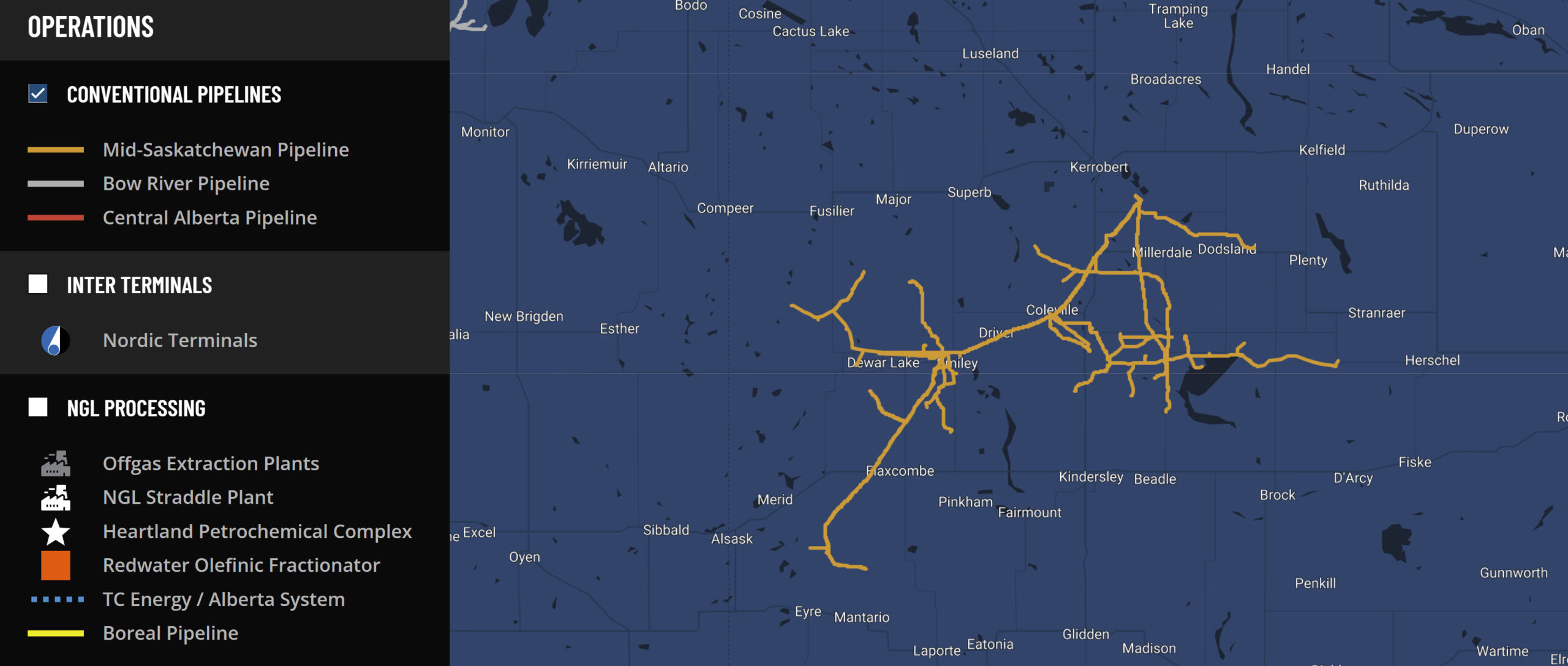 The yellow indicates the Mid-Saskatchewan Pipeline, the principle gathering system in west central Saskatchewan, operated by Inter Pipeline. Graphic from Inter Pipeline website.