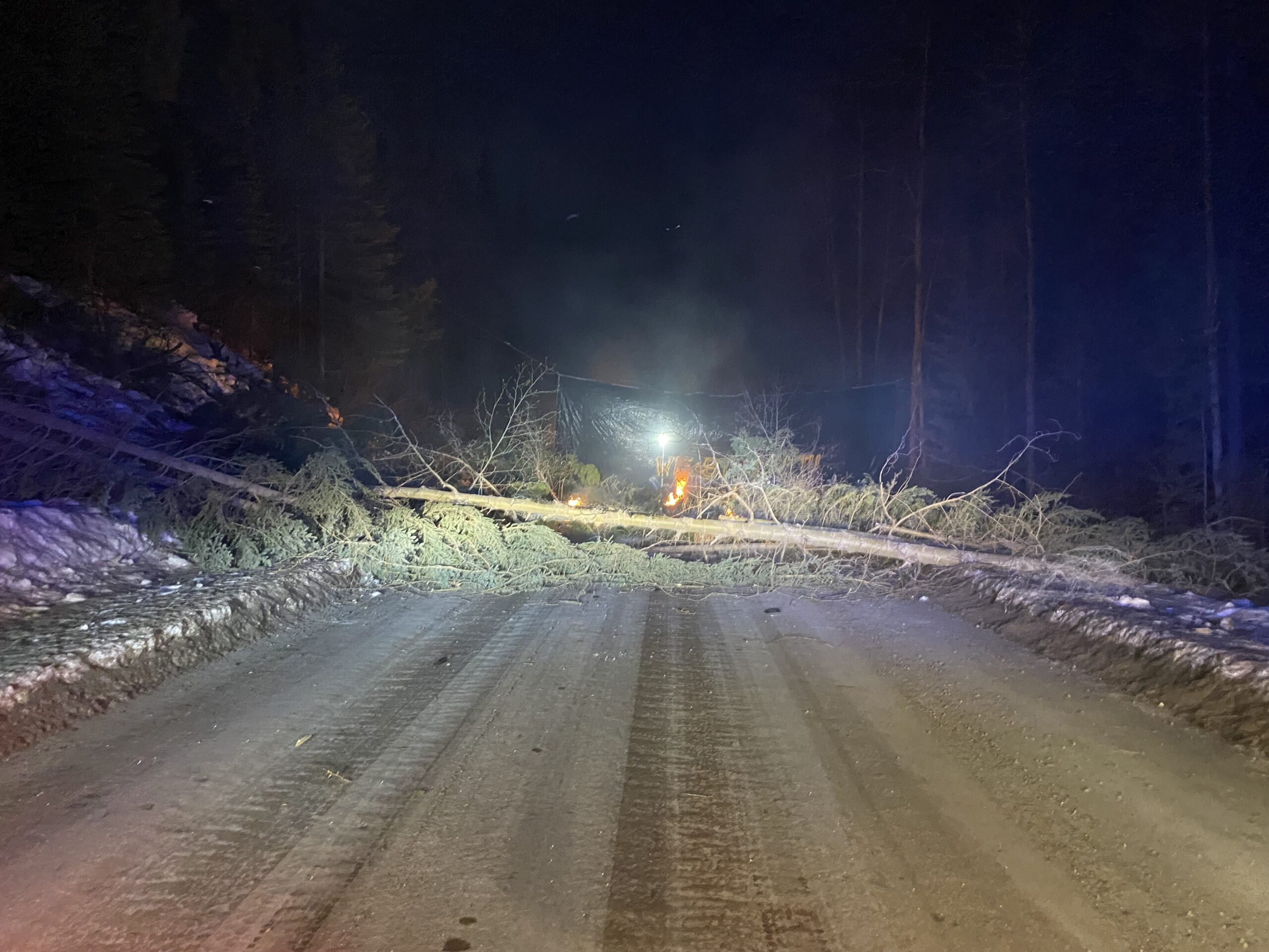 Police say when they tried to reach the worksite they were stopped by a downed tree, tar-covered stumps, boards with spikes sticking out of them and fires along the forest service road.