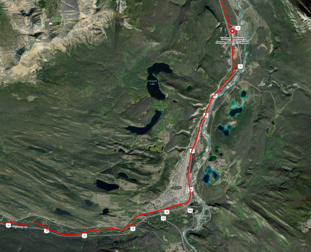 The red line indicated the Trans Mountain Pipeline right-of-way passing through the Jasper area. It passes right through the town, along the CN track, and is immediately adjacent to Highway 16 on the south side of the town. It runs roughly parallel to Highway 16 westbound. The red dot in the top right indicates the Jasper pump station. It’s 6 kilometres for the northeast corner of the Jasper townsite. Bing Map, modified by Brian Zinchuk.