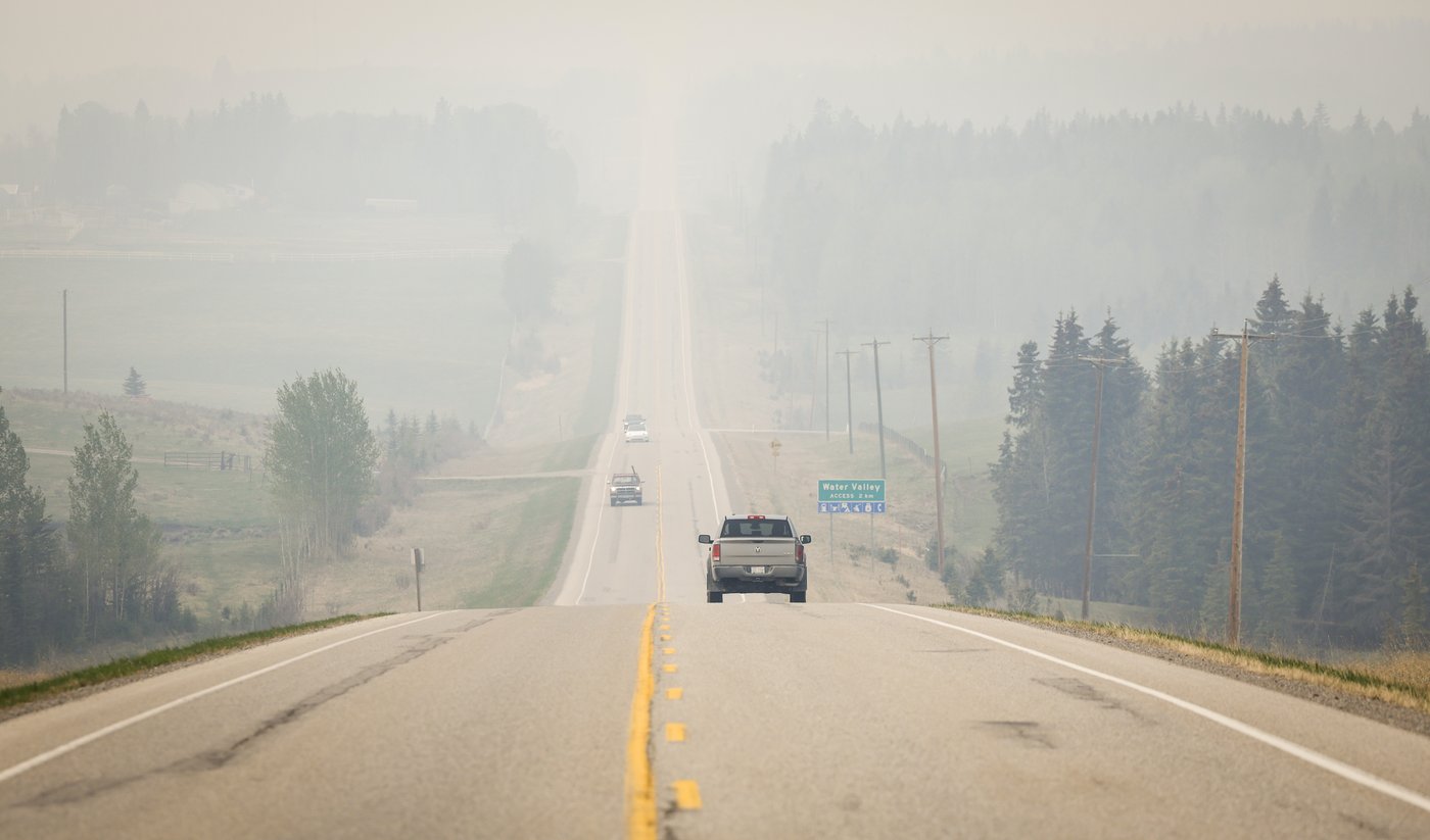 NuVista Energy Ltd. says it was able to restart most of its operations over the weekend as more favourable winds and weather helped ease the wildfire situation near its operations in Alberta. Thick smoke from wildfires blankets the landscape near Water Valley, Alta., 100 kilometres northwest of Calgary, Tuesday, May 16, 2023. THE CANADIAN PRESS/Jeff McIntosh