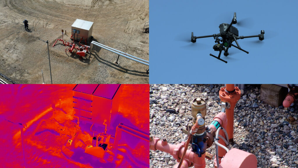 Here are three of the views from Predator Inspection’s quad sensor – top left is the wide angle, providing a sense of location. Bottom left is thermal. Bottom right is high power zoom, which is aligned with the laser methane detector. Top right shows the drone overhead. In this case, it was about 20 metres above. The purpose of the laser methane sensor is to detect fugitive emissions. Photos by Brian Zinchuk