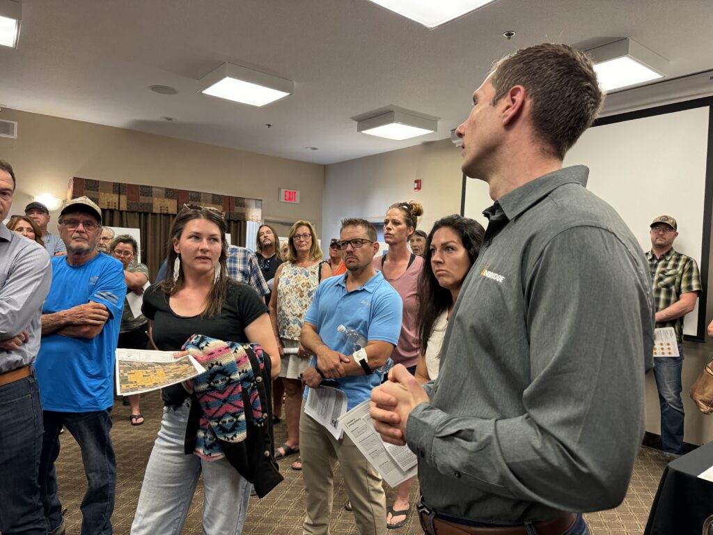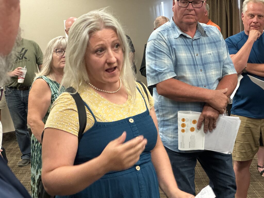 Another woman said, “We all bought properties away from town. It’s our oasis. I have seven kids. And I go in my garden, looked up at the open blue sky, and a nice starry night. And I’m wondering, are ratepayers and taxpayers like all of us here, are we going to get any kind of compensation for these indirectly involved?”