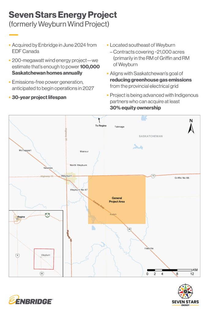 Formerly known as the Weyburn Wind Project, it now goes by Seven Stars Energy Project. It was in development for several years, both in gathering data and in land assembly. EDF Canada was the proponent, but that changed on June 21, when Enbridge acquired the project.