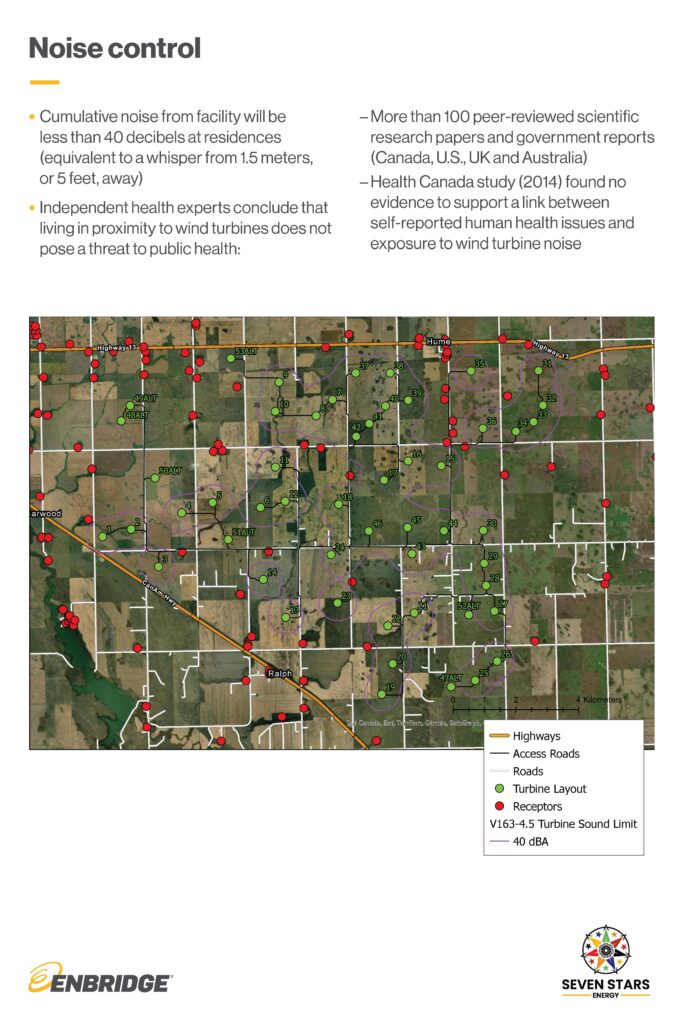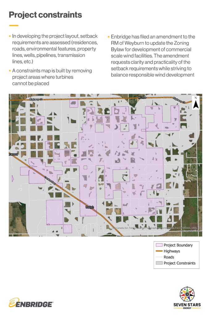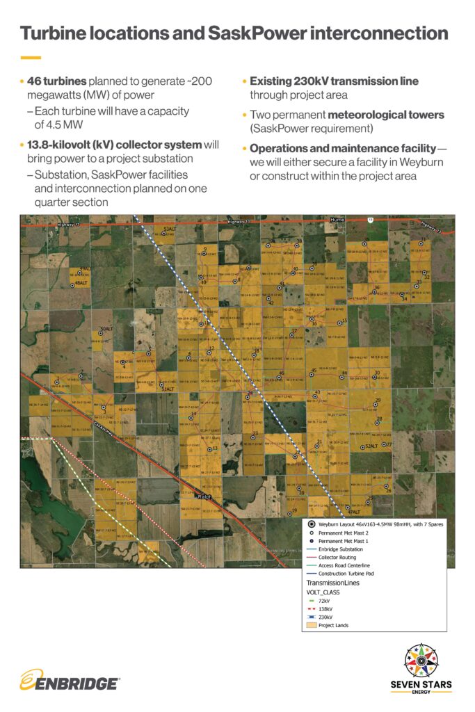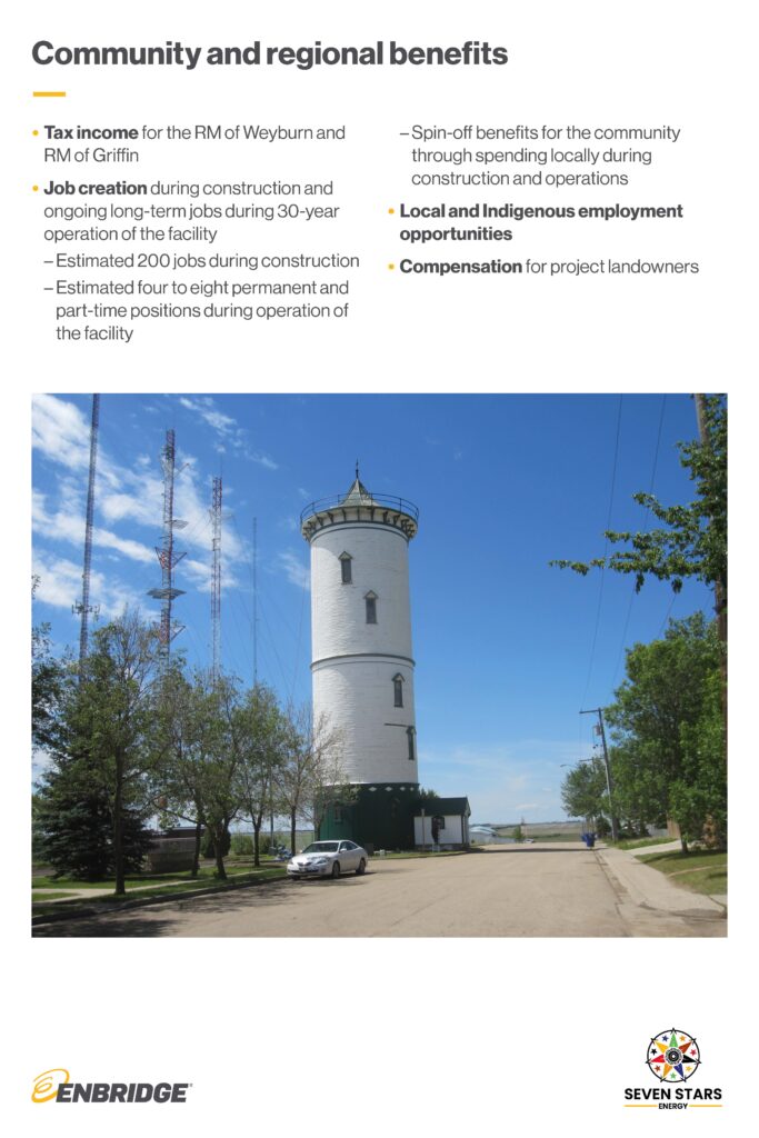 Enbridge: Enbridge is committed to the communities where we operate. The project will provide tax revenue to the local area, which will be determined by the size of the project. We estimate a 200-megawatt wind project with startup in 2027 would contribute approximately $800,000 annually combined for the RM of Weyburn, RM of Griffin and to provincial education taxes, beginning in 2028. (This estimate is based on current Saskatchewan tax policies, procedures and legislation and is subject to change).