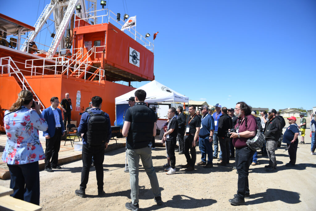 Pierre Poilievre, left, in front of Panther Drilling Rig 4 at the Saskatchewan Oil and Gas Show in Weyburn, June 1, 2022. Photo by Brian Zinchuk