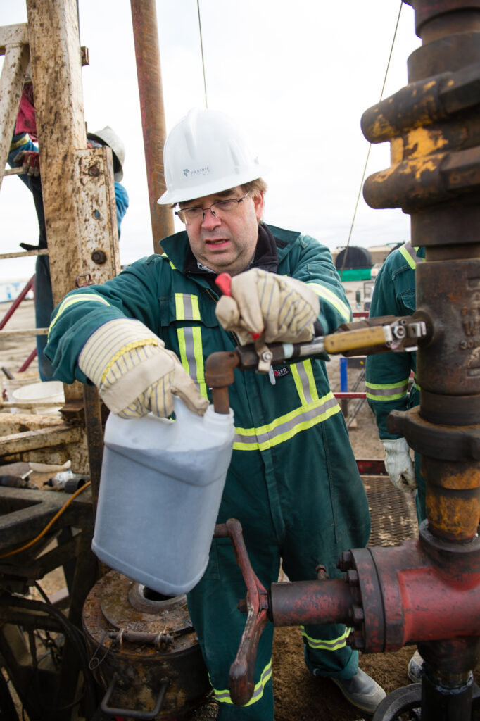 Dr. Ben Rostron taking the very first sample from the very first targeted lithium well drilled in Saskatchewan on Oct. 19, 2021, one year ago. Photo by Brian Zinchuk