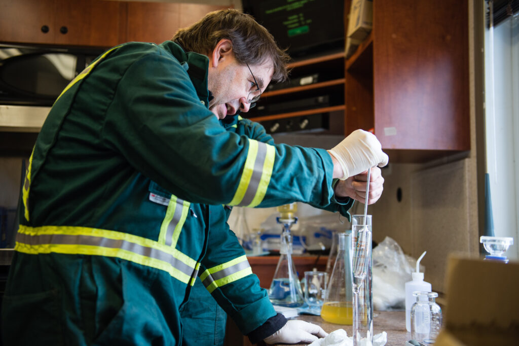 If this lithium thing pans out, this photo is one for the history books. Dr. Ben Rostron is performing the very first test of lithium-bearing brine taken from the very first lithium well drilled in Saskatchewan. That took place on Oct. 19, 2021. Photo by Brian Zinchuk