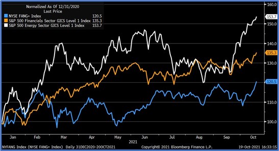 Liz Ann Sonders is the chief investment strategist for U.S. investment bank Charles Schwab & Co., Inc. She posted the following screenshot on Twitter Oct. 19 with the caption, “FANG+ losing ground relative to FE (financials and energy) … most popular growth/tech companies (blue) are up 21 per cent YTD, but financials and energy now leading pack.”