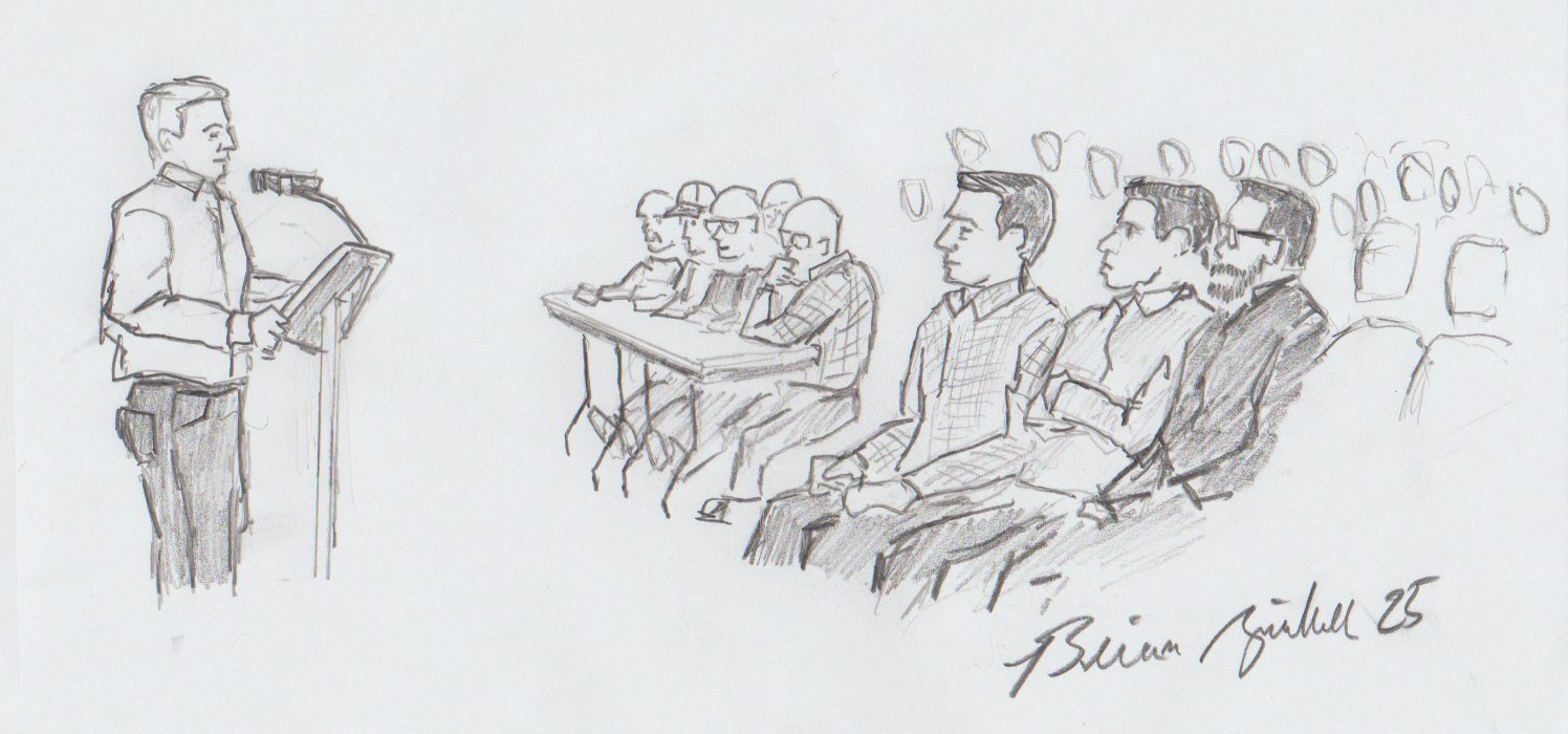 Alex McNichol, left, of Enbridge, addresses the public hearing on Dec. 8. In the centre are the RM of Weyburn council, and on the right are the lead representatives from Enbridge. Photos were not allowed. The sketch does not include the sign on the podium prohibiting photography or recording. And yes, at least four of the council members are bald.  Sketch by Brian Zinchuk