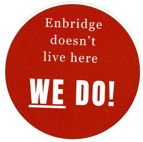 Several in attendance wore large red circular stickers on their chests which said, “Enbridge doesn’t live here. WE DO!”