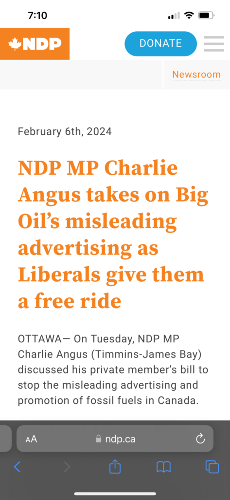 “We do not support the Private Member’s Bill introduced by Charlie Angus. Energy companies are important job creators in Alberta and Saskatchewan and shouldn’t be singled out by advertising restrictions. We already have legislation around false advertising, and we are more interested in advancing ideas that can actually help people. It is not helpful to pick fights that just polarize people and get in the way of the real solutions we need.