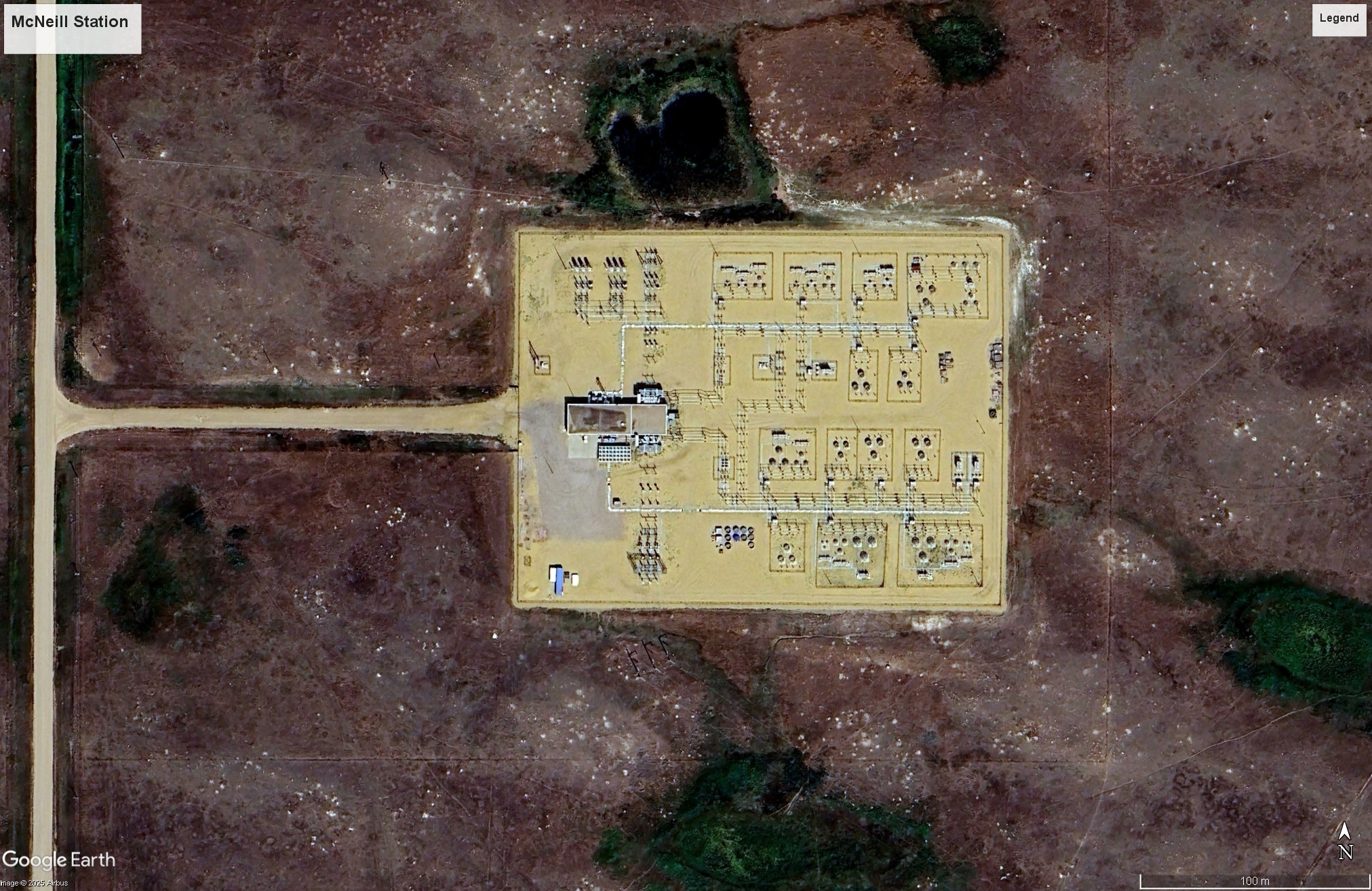 The ATCO McNeill Station is the intertie that allows Saskatchewan and Alberta power utilties to exchange power between them. It’s located just on the Alberta side of the border, southwest of Burstall, SK. Google Earth.