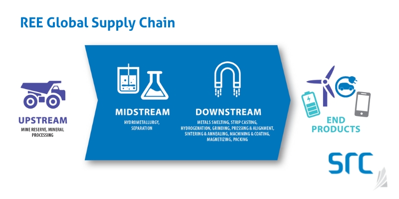 The supply chain for REEs is quite complex and includes a number of stages. Within that mining-to-magnet chain of processing, metal smelting is fifth: