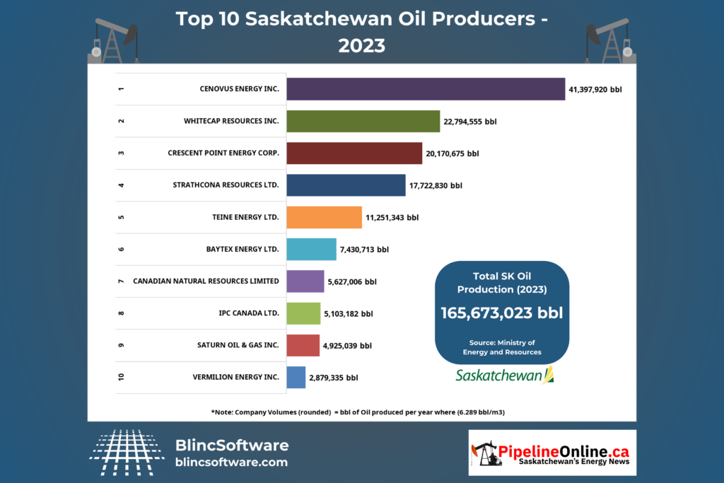 Vermillion Energy Inc., which operates in southeast Saskatchewan, produced 2,879,335 barrels of oil in 2023, placing it in 10th spot.