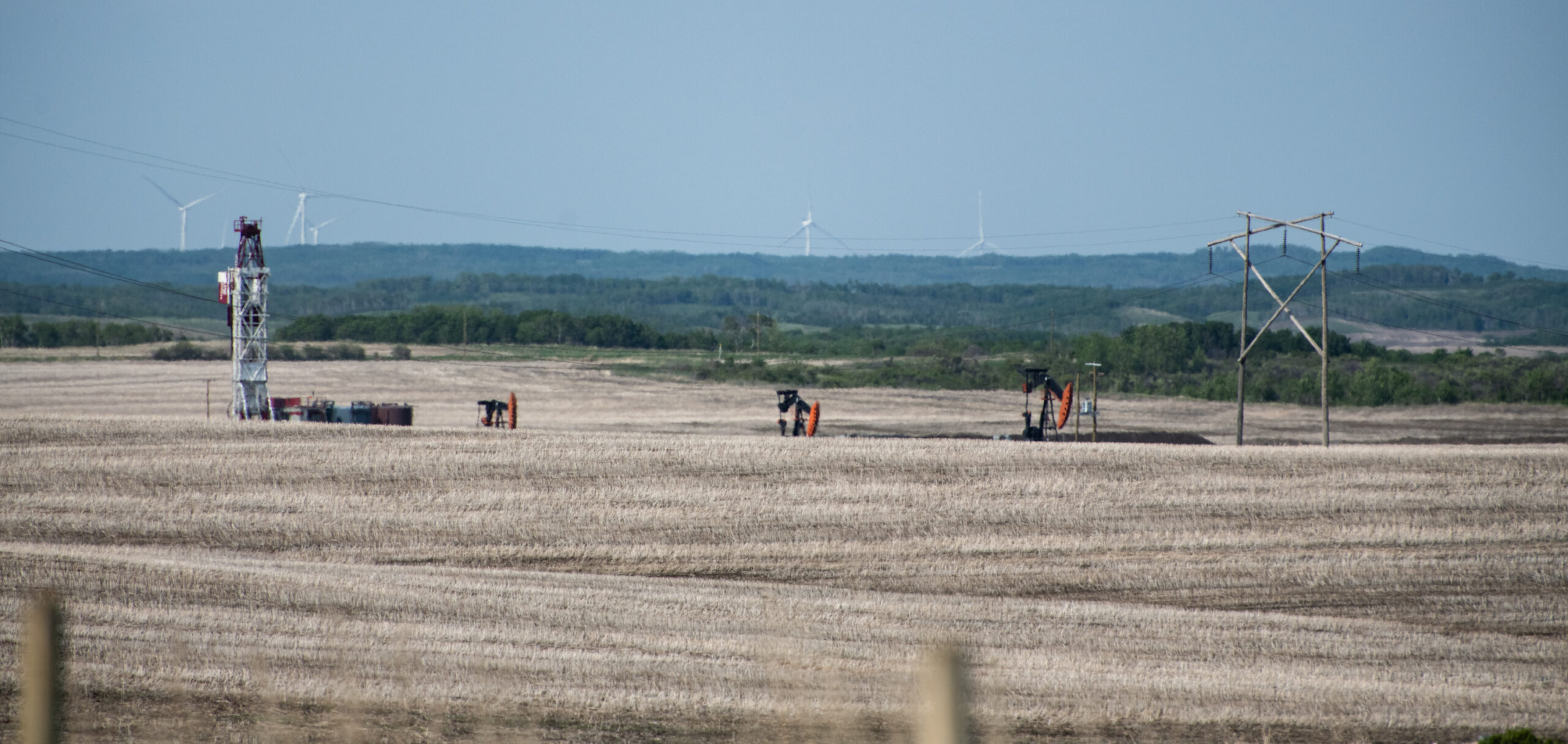 On the horizon is the Bekevar Yotin Wind Facility, which was churning hard at 4 p.m. on Wednesday, May 28, as seen from the Warmley area. In the foreground is a Stampede Drilling rig, racked at the time. SaskPower workers just happened to be patrolling along the transmission line right of way at the time. Photo by Brian Zinchuk