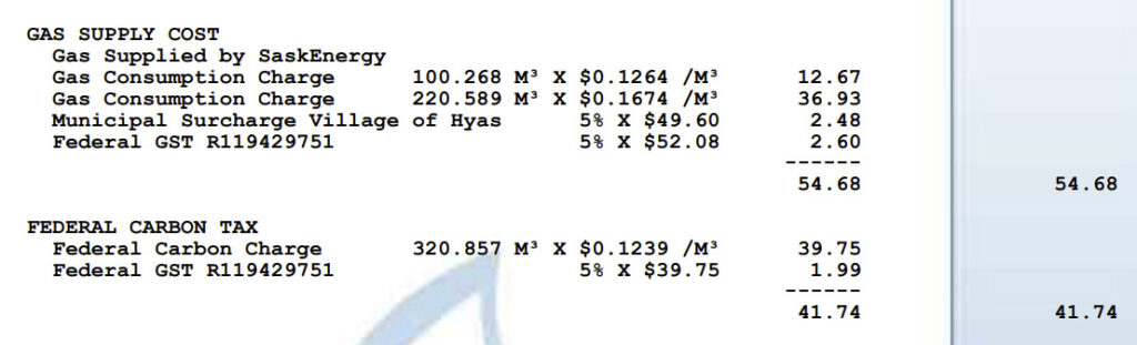 Example of the carbon tax applied to a house in Hyas, Saskatchewan, in October, before it got cold. The carbon tax was roughly 80 per cent of the gas cost.