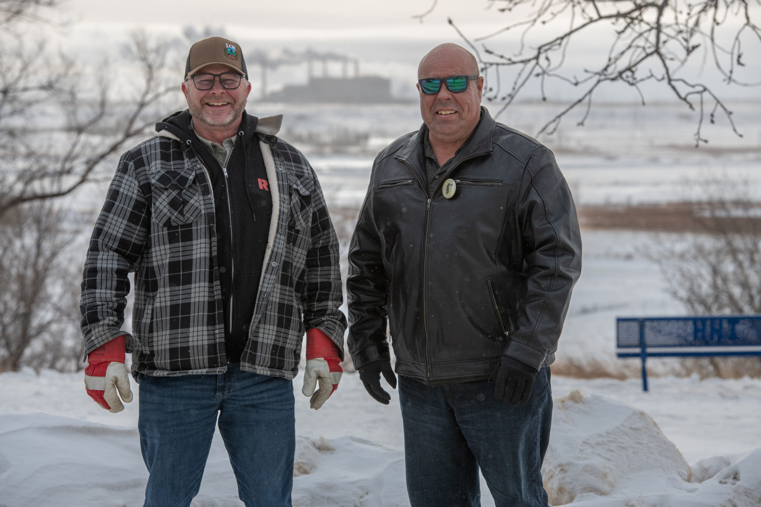 RM of Estevan Reeve Jason LeBlanc, left, and Estevan Mayor Tony Sernick stand with Boundary Dam Power Station behind them, in the distance. Photo by Brian Zinchuk