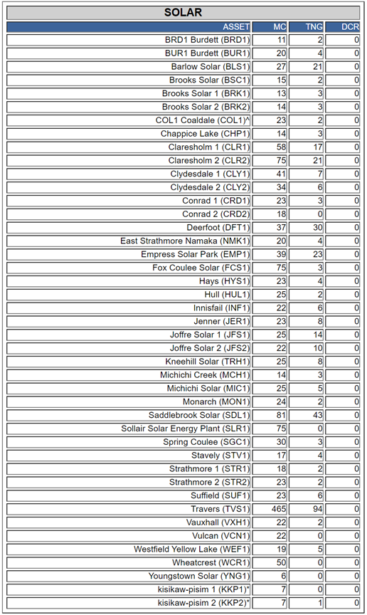 Solar generation in Alberta at noon on Sunday, Jan. 28. MC is maximum capacity in megawatts, TNG is total net to grid, and DCR is dispatched and accepted contingency reserve. AESO