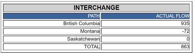 The province definitely wasn’t short on power, however, Ample wind generation, at 2,260 megawatts out 4,481 megawatts capacity. The internal load was just 10,323 megawatts. The province was exporting near its maximum capacity to British Columbia, sending 935 megawatts over the Rockies. It was importing 72 megawatts from Montana and zero from Saskatchewan.