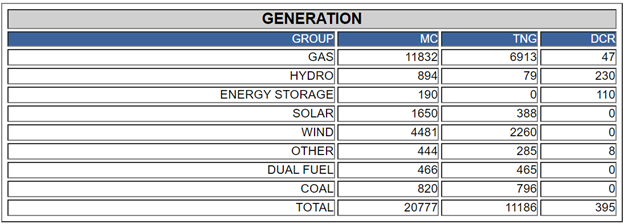 Total generation in Alberta at noon on Sunday, Jan. 28. MC is maximum capacity in megawatts, TNG is total net to grid, and DCR is dispatched and accepted contingency reserve. AESO