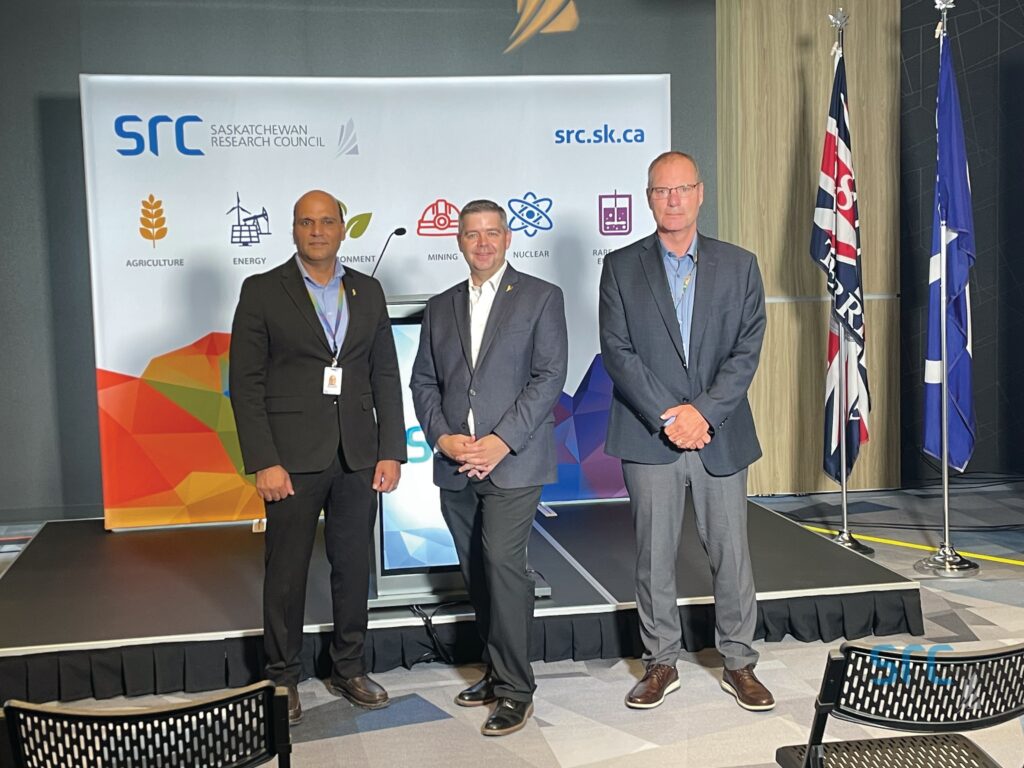 From left to right: Dr. Muhammad Imran, SRC Vice-President of Rare Earth Elements, Honourable Jeremy Harrison, Minister Responsible for SRC, and Mike Crabtree, SRC President and CEO at a media scrum.