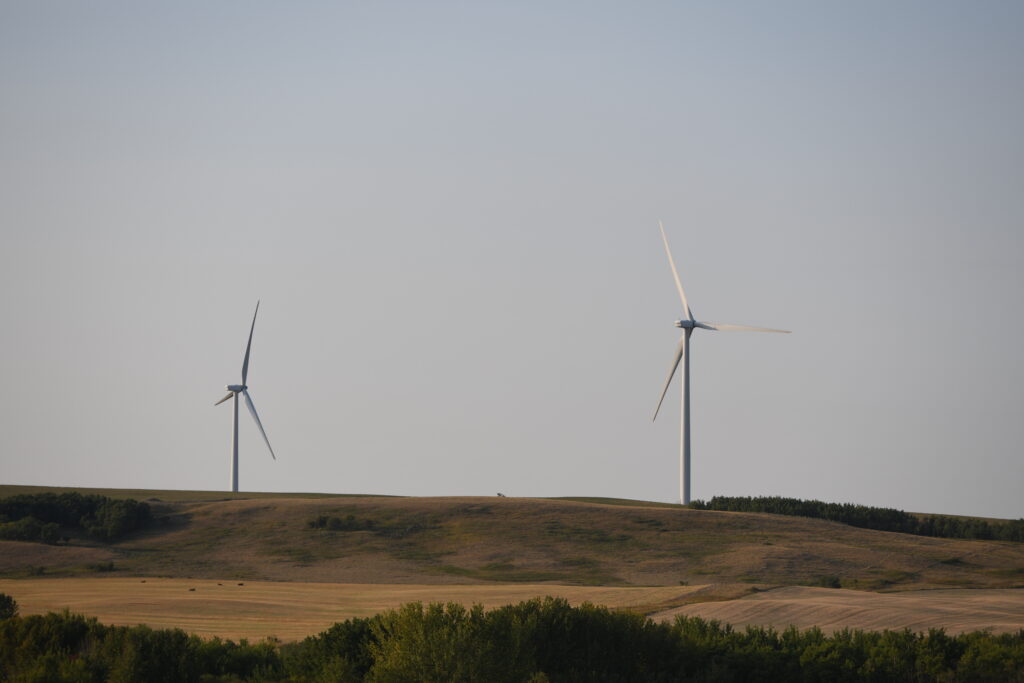 This is the Bull Creek Wind Farm, northeast of Provost, Alta on Sept. 12. On that day, half the turbines were not turning and the other half were barely turning, or ramping on and off. The wind turbine on the right is so close to the Saskatchewan border, it’s shadow falls on the Land of Living Skies. The right edge of the photo is Saskatchewan. Photo by Brian Zinchuk.