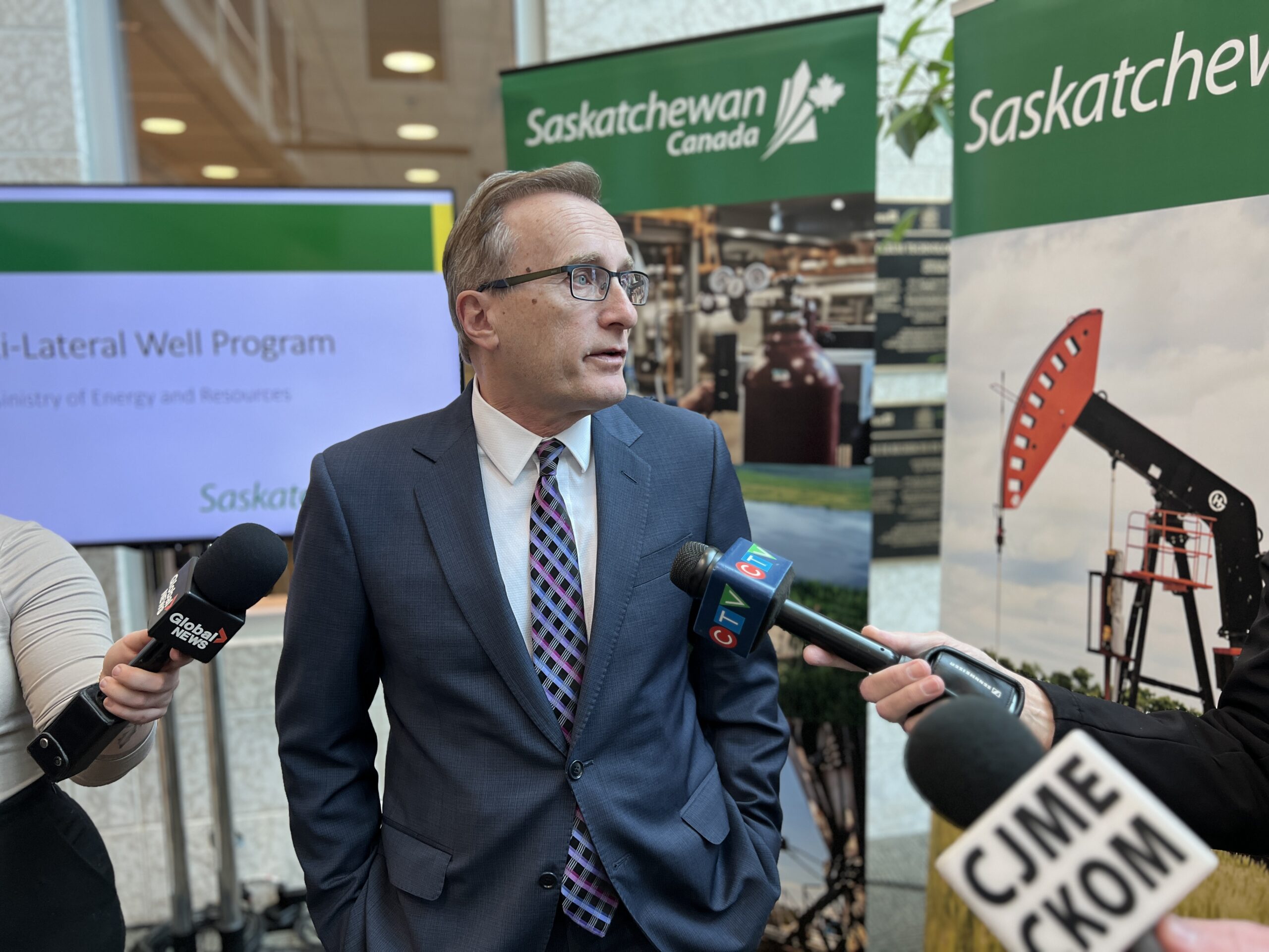 Minister of Energy and Resources Jim Reiter on April 30, 2024, announcing the Mult-lateral Well Program. Photo by Brian Zinchuk