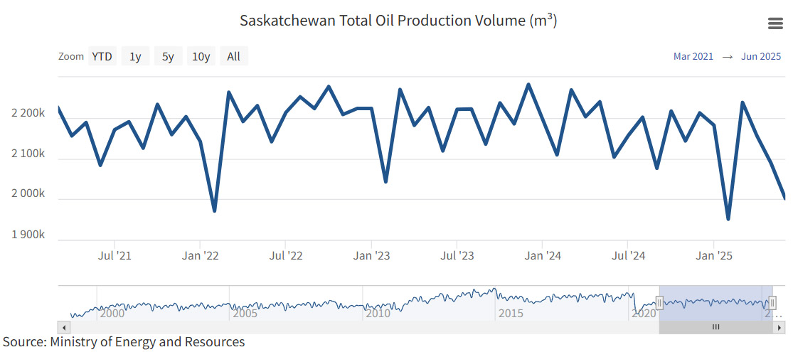 Saskatchewan oil production from April, 2021 to June, 2025. Saskatchewan Dashboard, Government of Saskatchewan