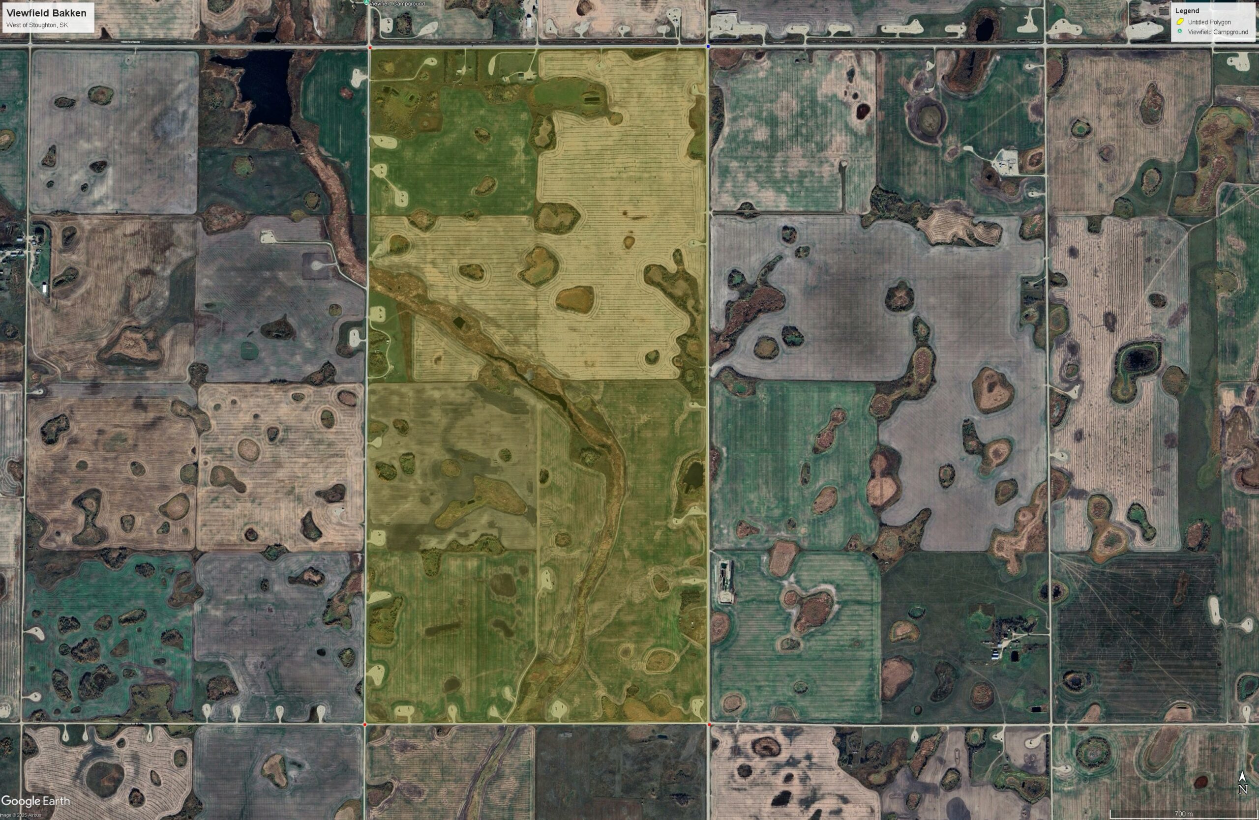 This is the heart of the Viewfield Bakken, just two miles west of Stoughton with Highway 13 on the north edge. Count all the wells in this two-section block highlighted in yellow. Half of those wells cover the other side of the road. The remaining are within these two sections. It is now possible to essentially replace all of those wells with just one, singlular open hole multi-lateral with two mile-long laterals. And three mile-long laterals are on their way, which would add one more section. In this case, there are 23 lease pads within that block (not counting the ones on the north side of the road). Similar exposure to the reservoir can now be done with just one lease pad. Google Earth.