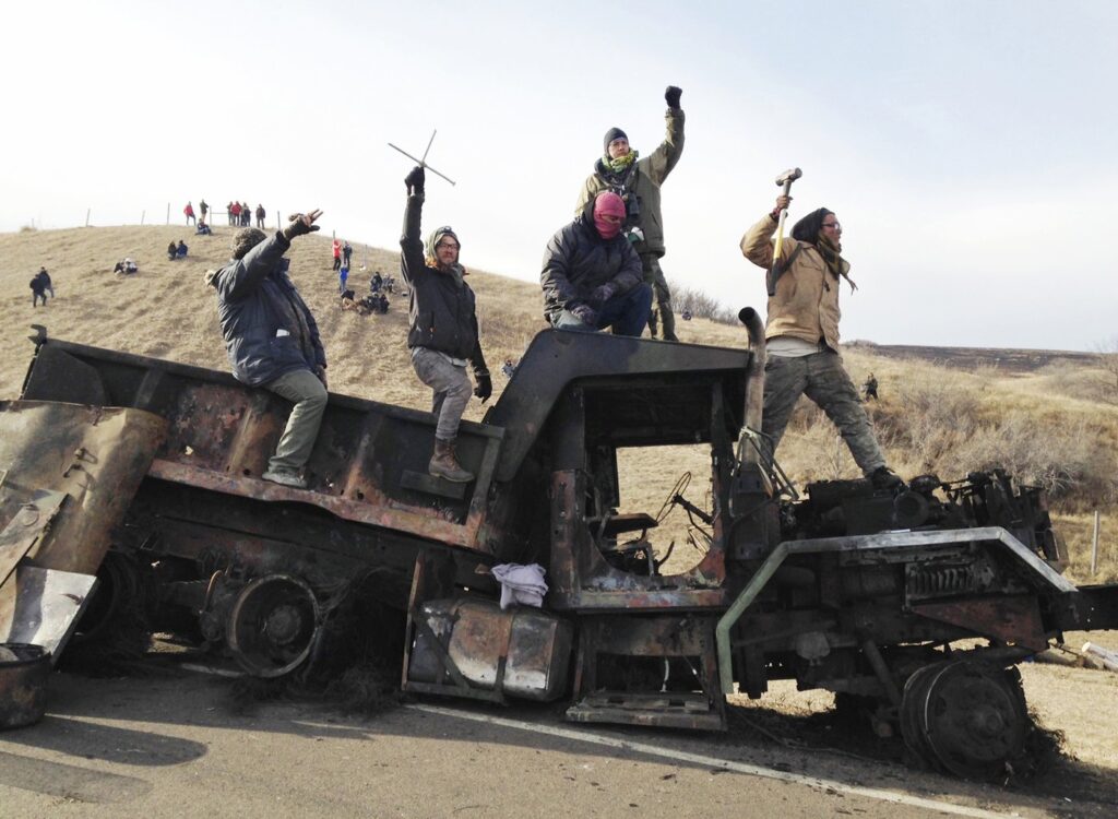 FILE – Protesters against the Dakota Access oil pipeline stand on a burned-out truck, Nov. 21, 2016, near Cannon Ball, N.D. North Dakota is set to take the federal government to trial on Thursday, Feb. 15, 2024, for the costs of responding to the Dakota Access Pipeline protests, the culmination of an unusual and drawn-out court fight. (AP Photo/James MacPherson, File)