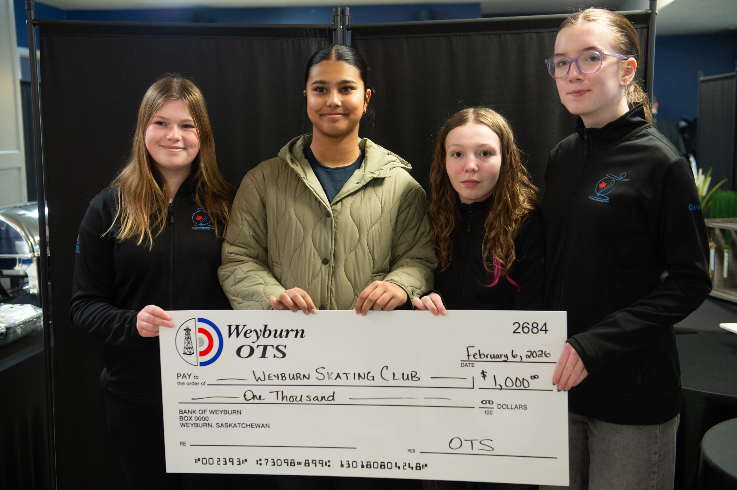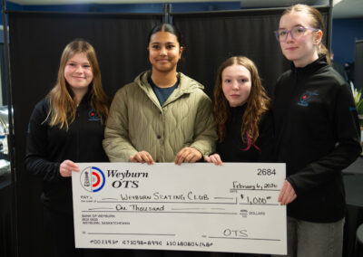 Weyburn Skating Club, represented by (in no particular order) Brooklyn Hay, Rehaam Manzoor, Sara Woodard, and Clara Crooks recieved $1000.