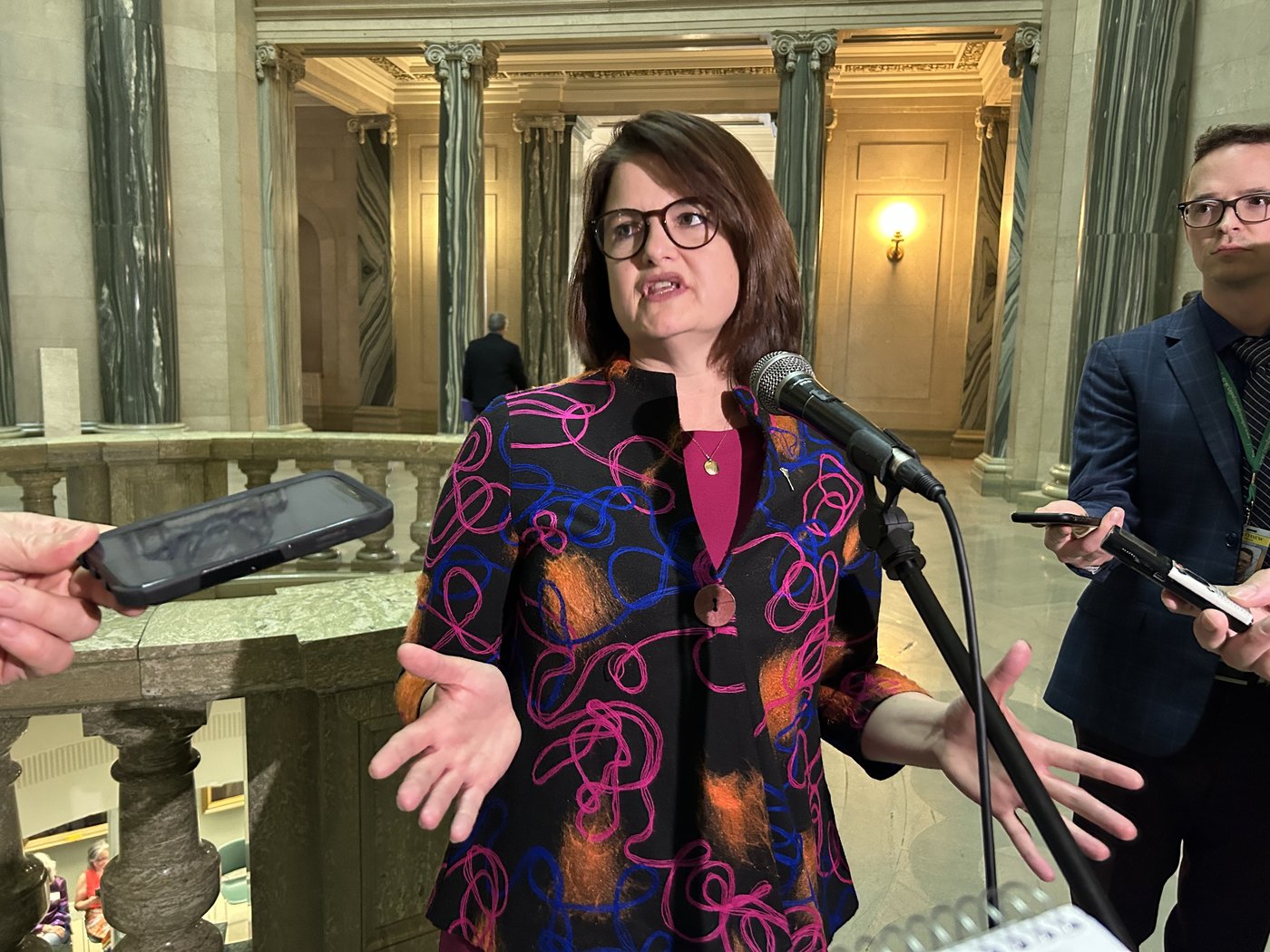 Saskatchewan NDP Leader Carla Beck speaks to reporters in Regina on Wednesday, May 3, 2023, after being removed from the legislature chamber. THE CANADIAN PRESS/Jeremy Simes