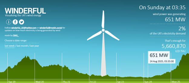 With reference to Scotland and the United Kingdom, according to Winderful.uk, yes, indeed, there are times when wind output makes up 61 per cent of the UK’s electricity demand, at 12,503 megawatts at 6:55 p.m. GMT on Aug. 25. But just one day earlier, at 3:35 a.m., Sunday, Aug. 24, wind output was 651 megawatts, or 2 per cent of the UK’s energy needs. That’s a variance of barely any power generation at all to over half in less than two days.